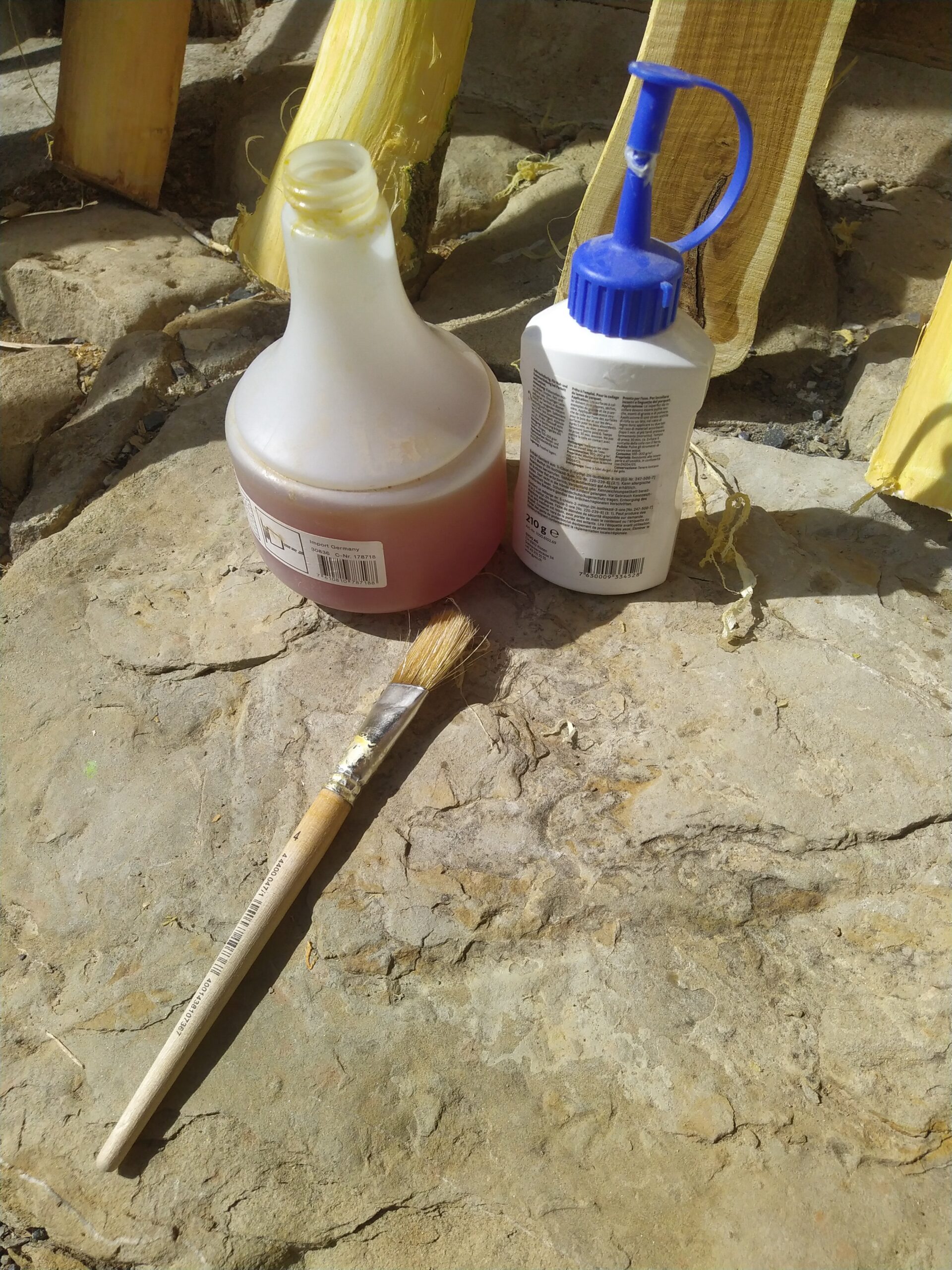 Once the pieces are cut and the bark is removed, the Sapwood and the ends need to be sealed quickly – otherwise the wood will check in no time. I do use shellac to seal the sapwood and white wood glue for the ends. The good thing about shellac is, that its easy removable later with only a little alcohol when you finally make your bow.