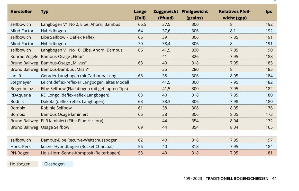 Together with the magazine “Traditionell Bogenschiessen”, we tested a large number of longbows on the shooting machine at the archery fair in Eigeltingen. It turned out that the classic wooden bows were in most cases performed better than modern bows made of glass and carbon. The fastest bows were of course from selfbow.ch Check this out: